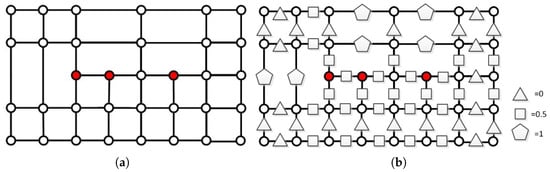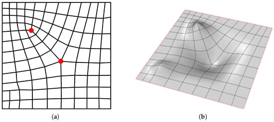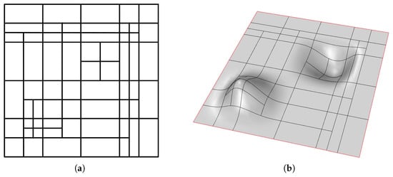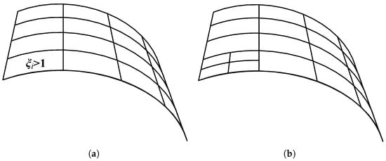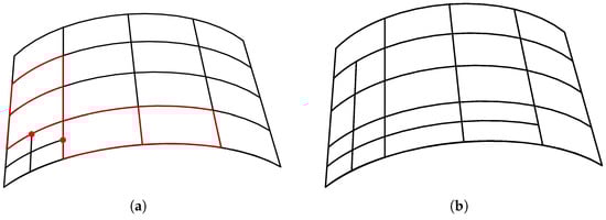 The Bézier extraction operator is used to convert T-spline elements into Bézier elements, and performs canonical treatment of T-junctions, which are similar to ‘hanging nodes’ and cannot be allowed in the mesh of the traditional finite element method. Figure 5a shows a cubic T-mesh, where the elements with red borders cannot achieve internal continuity due to the T-junctions (indicated by red circles). Through the segmentation of all the elements influenced by T-junctions, Bézier extraction delimits areas in which all element T-spline basis functions are . Therefore, these delimited polygons are called Bézier elements, as shown in Figure 5b. In addition, from the perspective of programming, the majority of classical finite element procedures, including parts of shell kinematics and nonlinear constitutive laws, could be easily reused in isogeometric analysis with the Bézier extraction method. To simplify the implementation of the visualization pipeline, only the Bézier mesh rather than T-mesh is plotted with the obtained results in this paper. The details of Bézier extraction are presented in [47,48].