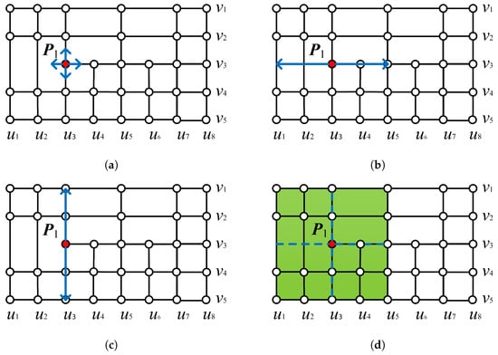 The knot interval vectors corresponding to the control point : (a) traveling from the ; (b) u-direction knot interval vector; (c) v-direction knot interval vector; (d) domain of definition associated with the control point .