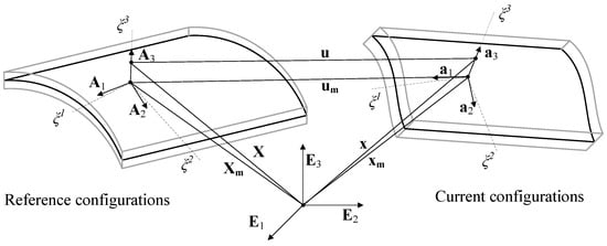 The lowercase letters are used to indicate the deformed shell, and the uppercase letters indicate the undeformed shell. For the shell structures under finite strains, the right Cauchy–Green deformation tensor and the deformation gradient are represented as
