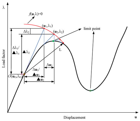 In the simulation of large deformation elastoplastic shells, overcritical behavior of the thin-walled structures, e.g., failure or buckling, and instabilities in the plastic material, similar to metals, will cause a nonlinear load–displacement equilibrium path, as shown in Figure 7. In such a case, a certain load may correspond to multiple displacement solutions, which makes the classical Newton–Raphson method in Section 3.4 invalid. For the computation of such an equilibrium path, the arc-length method [56,57,58] is a popular choice to apply a constraint equation , where is the load factor. The residual vector in (37) can be formulated as