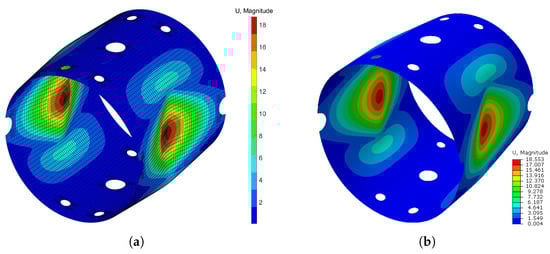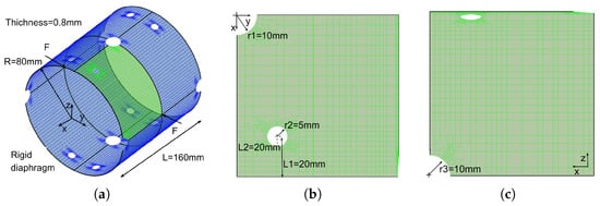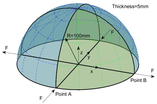 The base vectors and are expressed in Equation (21), respectively defined in the deformed shell and the undeformed shell. Due to the fact that the deformation cannot be neglected in finite deformation, the thickness stretch is defined by , and the thickness base vector can be corrected as . Thus, Equation (24) can be modified by