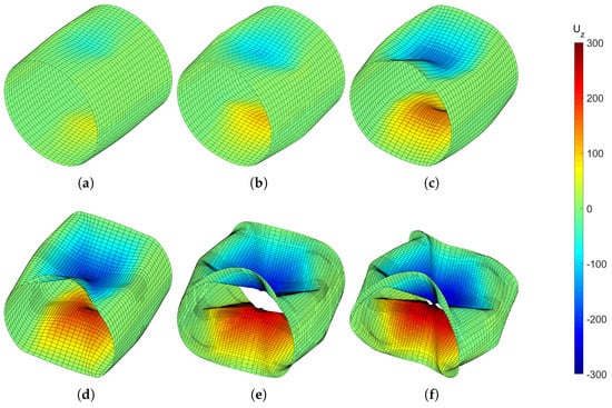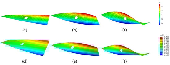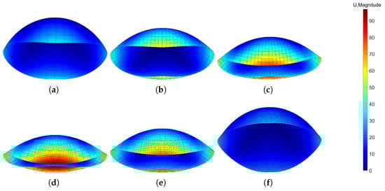 The z-displacement of the rectangular shell at various deformation stages: (a–c) result from IGA, rotation angle 60°, 120°, 180°; (d–f) result from FEA, rotation angle 60°, 120°, 180°.