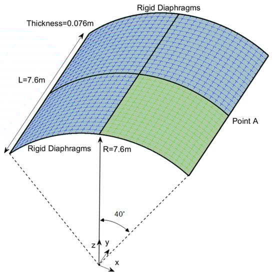 A series of traditional finite element methods have been proposed to solve geometrical or material nonlinearity in various types of shell structures [1,2,3,4,5,6,7]. There are two dominant shell assumptions that are widely used in shell analysis. One is the Reissner–Mindlin (RM) theory for thick shell analysis, which requires only C0 continuity across element boundaries. Another is the Kirchhoff–Love (KL) theory for thin shell analysis, for which a C1 discretization is necessary. Research on the latter has been popular in the last few decades with the development of isogeometric analysis (IGA) [8,9]. The requirement of C1 continuity across element boundaries, which is a primary barrier to the development of KL shell theory in finite element analysis, has been naturally satisfied in IGA. What is more, the Kirchhoff–Love shell theory is applicable to thin shell structures with , where R is the radius of curvature of the surface and t is the thickness of the shell. However, for the analysis of thick shells, RM shell theory was found to be more accurate than KL theory because RM shell theory considers the transverse shear deformation, which is negligible in case of KL shell theory.