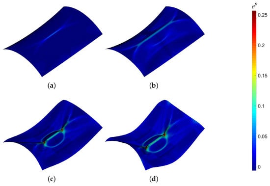 In our paper, five Gaussian integration points are used in the thickness direction, which is a time-consuming calculation process. Simo and Kennedy [73] advocated an approach based on directly expressing moment versus curvature relations for elastoplastic shells. What is more, Armen et al. [76] proposed a novel implicit rate type response relation, bypassing the integration of elastoplastic stress–strain relationships across the thickness of the beam at each time step. These methods may bring efficiency and accuracy to the isogeometric analysis of elastoplastic Kirchhoff–Love shells, and will be considered in our future study.