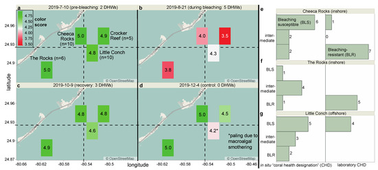 Map of study sites (a–d) and breakdown of field-tracked and lab coral phenotypes (e–g). Field sample sizes and the color score legend are both in a. DHW = degree-heating weeks. Panels (e–g) present the breakdown of samples from three of the four study reefs (excluding the test site, Crocker Reef) with respect to their bleaching susceptibility, and the values adjacent to the columns signify number of colonies (rather than genotypes) since, in certain cases, colonies of the same genotype demonstrated different thermotolerances. The colony health designations (CHD) of lab corals [11] from these same reefs have also been shown. Note that the five field-tracked colonies from Crocker Reef, which did not feature in the experiments, were characterized by the following CHD: bleaching-resistant (n = 1), intermediate (n = 2), unknown (n = 1; unable to locate colony at all survey times), and diseased (n = 1; succumbed to stony coral tissue loss disease & was excluded from analysis).