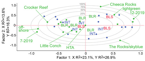 Partial least squares correlation loading plot. The 16 proteins measured in all field samples were the model Y’s (blue dots) while the following were considered as putative drivers of variation (green dots, of which several have been labeled): reef site (Cheeca Rocks, The Rocks, Little Conch, & Crocker Reef), shelf (inshore vs. offshore), date (Jul. & Dec. only), host genotype (black(a), black(f), black(g), black(i), black(r), skyblue, darkred, lightgreen, or unknown), fragment health designation (healthy control, high-temperature-acclimating [HTA], sub-lethally stressed, & actively bleaching), and colony health designation (CHD; bleaching-susceptible [BLS], bleaching-resistant [BLR], & intermediate [INT]). The samples themselves are labeled by their CHD (red, blue, & green for BLS, INT, & BLR, respectively) and include only 13 biopsies since only training data are shown.