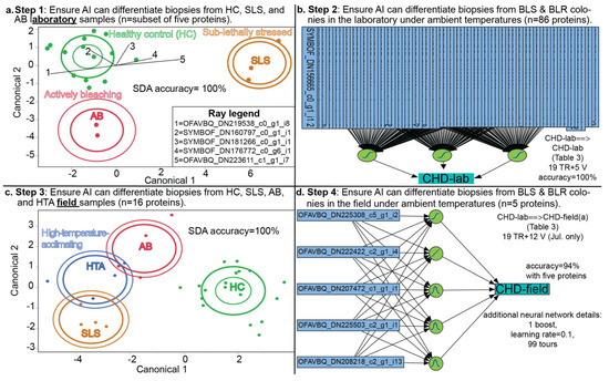 Progressive training of the AI with coral proteomic data. In the stepwise, discriminant analysis (SDA) canonical correlation plots, inner and outer ellipses represent 50 and 95% confidence, respectively, and for the latter, rays are shown only in Supplementary File S2. Note that for step 4, we have shown only one example of the “lab→field” approach in which lab-derived protein profiles were used to predict field coral bleaching susceptibility (“CHD-field”); models trained with field data exclusively are instead shown in Table 5. Note that in step 4, a third, intermediately bleaching-susceptible phenotype was considered as a model Y (vs. only bleaching-susceptible [BLS] vs. bleaching-resistant [BLR] as possible colony health designations [CHD] in the lab samples). AB = actively bleaching, HC = healthy control, HTA = high-temperature-acclimating, SLS = sub-lethally stressed.