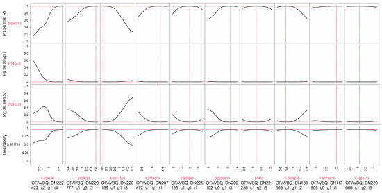Desirability analysis based on the neural network “CHD-field→CHD-field(e)” (Table 5). The “P” before the terms on the y-axes refers to the probability, and the protein concentration levels associated with a 99.7% chance of a coral being bleaching-resistant (BLR) are shown. The desirability approached the target value of 1 since there was <1% chance of a coral demonstrating these protein concentrations either being intermediately bleaching-susceptible (INT) or fully bleaching-susceptible (BLS). Only the top 10 most influential proteins of all 28 used in the model have been shown (ordered from most influential on the left to least on the right); values in red above protein accession numbers represent the target levels (raw iTRAQ values) that resulted in maximum desirability.