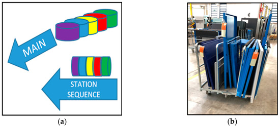 One of the variants of the stationary kit category is the so-called “Station-Sequence” policy: in this approach, the stationary kits are created with sequences of homogeneous parts (both in terms of typology and physical attributes) that match the sequence of models that are going to be assembled. Figure 1a and 1b show the station-sequence concept and an industrial example, respectively.