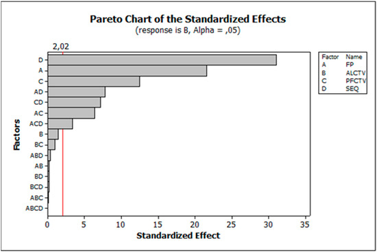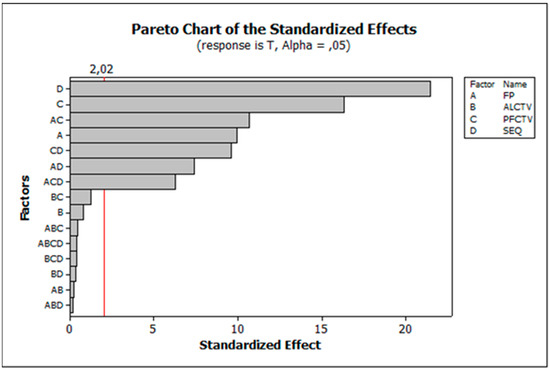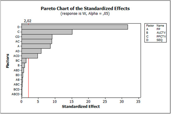 Inferential analysis was conducted first, in order to quantify the magnitude of the effects of the input variables on the simulation outputs. Then, an ANOVA analysis was performed, aimed at the determination of the interactions between input and output parameters. With regards to the inferential analysis, a Pareto chart of the standardized effects was drawn for each output parameter (T, W, and B) and is represented in Figure 3, Figure 4 and Figure 5 respectively. The interaction plots of the ANOVA analysis are also reported for each considered output parameter (T, W, and B) and presented in Figure 6, Figure 7 and Figure 8 respectively.