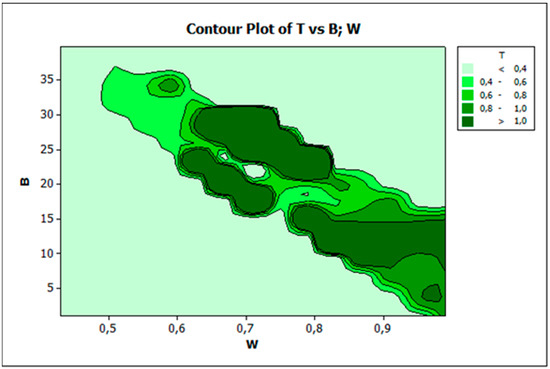 To visualize the relations between the values of the three output parameters across different simulation scenarios, a contour plot is shown in Figure 9: W and B are represented on the x- and y-axis, respectively, while different levels of the value of T are represented in a green-shading scale.