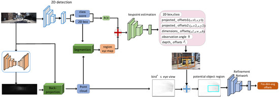 Our algorithm framework is shown in Figure 1. In the first place, we perform 2D detection and depth estimation to obtain the 2D region of interest and depth map. Then, we fuse the 2D region of interest and region pseudo-lidar generated from the depth map and also feed the fused data to the keypoint estimation network for the estimation of the coarse initial 3D box. For the purpose of auxiliary learning, we again estimate the 2D parameters when performing 3D object detection, hoping to utilize the high-precision characteristics of 2D detection to help the learning of the 3D parameters. Finally, we use the bird’s-eye view features generated from the pseudo-lidar information to refine the initial 3D box. The visualization illustration of the original image, pseudo-lidar, and bird’s-eye view used in our algorithm is shown in Figure 2.