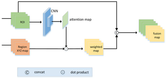 The value at each pixel position of the 2D region of interest represents the RGB value of the color image and the value at each position of the regional pseudo-lidar represents the physical position of the pixel in the 3D space. It is difficult to achieve a good experimental performance by adding together these two-modal data for 3D object detection. AM3D [17] uses the attention map generated by the pseudo-lidar to selectively incorporate useful RGB image information into the position information of the pseudo-lidar. Considering that the pseudo-lidar generated by the 2D image has a certain error, the process of utilizing the pseudo-lidar to generate the attention map will amplify this error. Therefore, we design the following attention mechanism shown in Figure 3. Primarily, we feed the region of interest to a two-layer CNN to generate an attention map and perform a dot product between the attention map and the region pseudo-lidar to obtain a weighted region pseudo-lidar. Then, we superimpose the weighted region pseudo-lidar and the 2D region of interest on the channel to complete the fusion of two different modal information. The operation of the point product between the attention map and the regional pseudo-lidar promotes a competitive mechanism between the values of the region pseudo-lidar, encouraging the values at important positions and suppressing the values at unimportant positions, which can highlight the more important position. The mechanism helps the two-modal information to be more fully fused so as to better perform subsequent initial 3D object detection. Compared with AM3D [17], our attention map is derived from the more accurate 2D region of interest rather than the pseudo-lidar with a large error, which reduces the source of error and is beneficial to improving the precision of the 3D object detection. Considering the subsequent feature extraction problem of pseudo-lidar, AM3D [17], Frustum Points [41], Pseudo-Lidar [19], etc., directly use the existing lidar-based detection framework for 3D object detection. Most of these algorithms have high memory requirements and time-consuming training. In this paper, we use a lightweight two-dimensional convolutional neural network to process the pseudo-lidar fused with image information in the image mode. The convolutional neural network has a simple structure and short training time. The computing power and storage requirements are relatively low, which greatly improves the detection speed without reducing the detection accuracy.