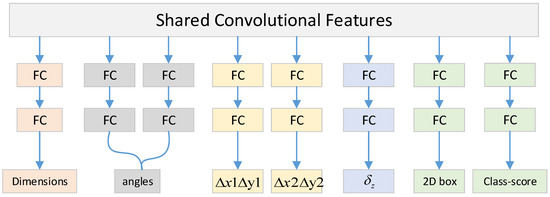 It can be seen from Formula (4) that in order to obtain the center point coordinates of the 3D box, we need to estimate not only the position of the projection point but also the depth value of the center point of the 3D box. As shown in Figure 5, at the end of the keypoint estimation network, there are three fully connected layers, after which is the detection head corresponding to the 3D box’s parameters. The depth detection head branch estimates a depth offset which is combined with the depth adjustment parameters and ( and are known parameters obtained from statistics of the same category in the dataset) to obtain the depth of the center of the 3D box by the following formula:
