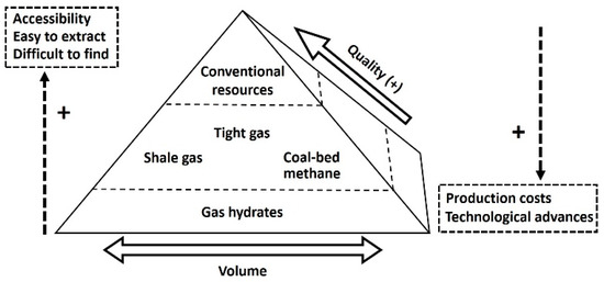 As an alternative to traditional sources of natural gas, depending on their geological characteristics, quality and volume, as well as other factors (accessibility, ease of extraction, location, cost, and production technology), there are four types of unconventional gas [2,3] (Figure 1).