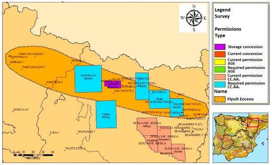 - Licencias de Prospección Petrolera (Permisos y Licencias Investigación Hidrocarburos). Archivo Técnico de Hidrocarburos (ATH). Ministerio para la Transición Ecológica y el Reto Demográfico. Available online: https://sede.serviciosmin.gob.es/es-ES/Paginas/aviso.aspx#Reutilizacion (accessed on 8 May 2022).