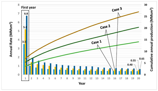 Production estimates have been calculated and represented based on three options, case 1: well without stimulation, case 2: well with 50% stimulation by fracking, and case 3: well with 100% stimulation by fracking (Table 4 and Figure 6).