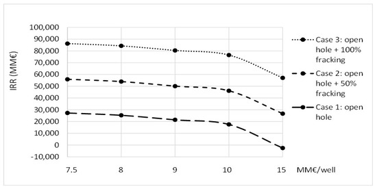 Estimated production based on production data from the Serrablo-13 well. Case 1: open well, Case 2: open well +50% fracking, Case 3: open well +100% fracking.
