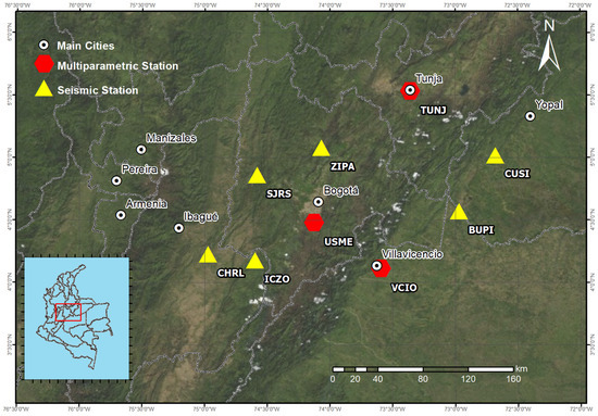 The USME station is a multi-parameter station that is part of the Seismological Network of the National University of Colombia [25]. Figure 1 shows the distribution of the network’s stations in the central region of Colombia. The USME station has a broadband triaxial seismometer, triaxial magnetometer, and non-polarizable electrodes.