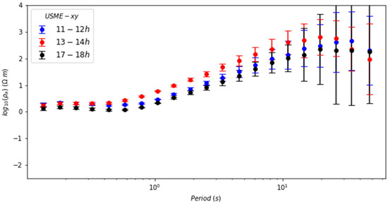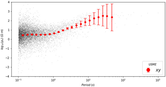 The parameter (), using Equations (2) and (3), will result in several dispersion points, as observed in Figure 3. Note how the figure is plotted as a function of the period () for ease of analysis (the longer the period, the greater the skin depth). After obtaining all the associated , a statistical data treatment is carried out for values of frequencies (periods) chosen in such a way that a reliable resistivity curve is obtained.