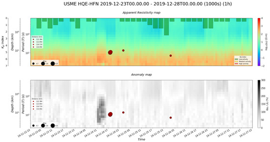 The map (Figure 5), which is obtained from our algorithm code, can be seen as a matrix of values of N rows and M columns (Equation (6)) where each column represents a 1-h time window, and each row represents each frequency/period point (N = ‘Number of point periods’ and M = ‘Number of partial windows’). Each column corresponds to the apparent resistivity-fitted curve (Figure 3); the only difference is the color assigned to each resistivity value (Figure 5).