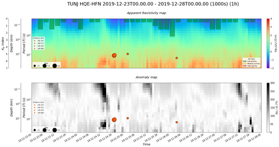The MT data processing in this study begins by converting a time series of magnetic and electrical signals to their frequency domain (using the Fourier transform (FT)), a stacking process over a 1-h time window (it is desired to see changes in the resistivity behavior each hour), to later operate their respective components, calculate the Schmucker–Weidelt transfer function from Equation (2), and finally obtain their associated values of . This procedure was performed by developing our algorithm code in Python, which can be obtained by consulting the authors. The processing was performed following all the mathematical guidelines given in [6].