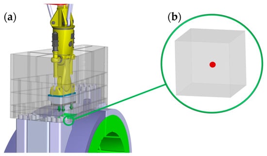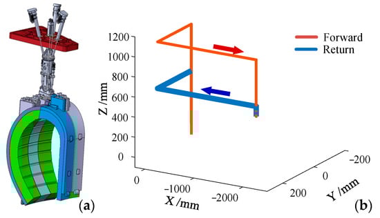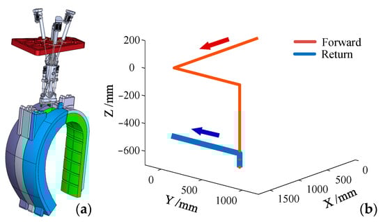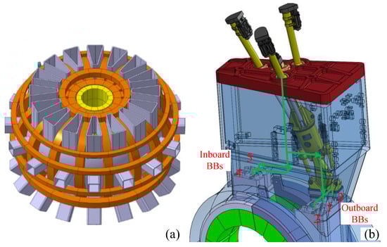 The current design lifetime of BB in the DEMO vacuum vessel is 5 years. To determine the optimal maintenance design, DEMO conducted a large and extensive architectural research study, which concluded that Multi-Module Blanket Segments (MMS) and Vertical Maintenance Schemes (VMS) are the preferred layouts for maintenance [6,7]. For the design of the BB transporter, extensive brainstorming was conducted at an early stage, mainly on the comparison of the series kinematic mechanism (SKM), the parallel kinematic mechanism (PKM), and the hybrid kinematic mechanism (HKM) [8,9]. Through the preliminary evaluation of different structures and the feasibility analysis of the structures’ functions, an alternative BB maintenance scheme is proposed based on the HKM. As shown in Figure 1b, the configuration of the HKM is developed based on the classic Tricept parallel mechanism, which is a 3UPS-PU parallel mechanism with 3-DOFs. The end of the HKM is a series mechanism rotating around three axes, mounted on a Tricept parallel mechanism kinetic platform, which gives the HKM 6-DOFs the ability to meet the end-effector position and orientation control requirements. The maintenance task of the inboard and outboard BBs can be finished separately by the trajectory control of the HKM. The special advantage of the HKM is that it has relatively high stiffness, high load capacity, and high position accuracy [10], and at the same time has a relatively large working space and simple design of the series robot [11,12]. The HKM can achieve relatively large positioning and orientation capabilities; therefore, it is suitable for applications in confined spaces within vacuum vessels.