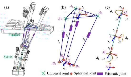 HKM structural features (a); HKM parallel mechanism coordinate system (b); HKM series mechanism coordinate system (c).