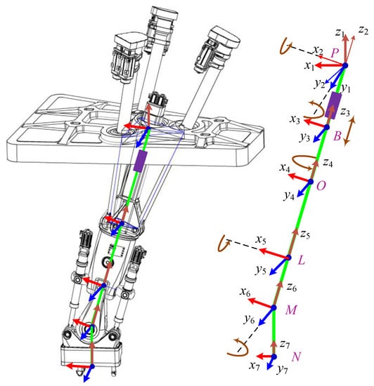 When the static platform of the parallel mechanism is locked in the position of the vertical ports of the vacuum vessel, the whole HKM can be equated to a 6-DOF series robot based on the forward kinematic solution . In order to represent the relationship between the motion of each joint, linkage and the end-effector, we use the Denavit–Hartenberg (DH) parameter method to establish the HKM forward kinematic model. The equivalent HKM kinematics equation established by DH parameters is as follows: