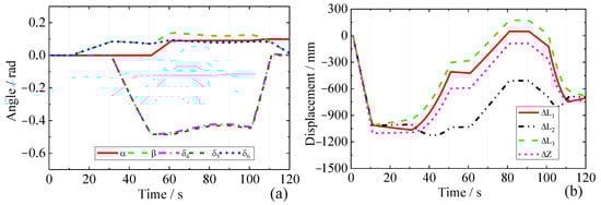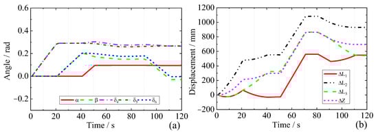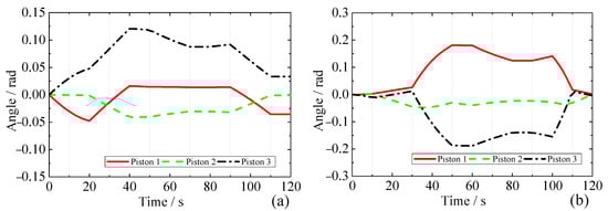 In order to calculate the HKM end-effector position error caused by the piston rotation, an HKM simulation model was built in Adams software. Based on the inverse kinematic solution of the HKM lifting left inboard and outboard BBs obtained in Section 3, the piston rotation angle can be calculated by simulation in Adams, as shown in Figure 9. The results show that the piston rotates during the lifting of both the inboard and outboard BBs. During the lifting of the left outboard BB, piston 3 produces the maximum rotation angle at the time of 40 s. During lifting of the left inboard BB, piston 3 produces the maximum rotation angle at the time of 55 s. With the HKM of each piston’s thread at a pitch of , combined with the angular error , the stroke error of each piston can be obtained: