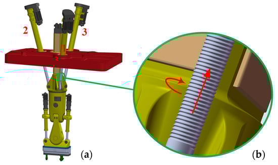 Since oil is not allowed in the high-temperature clean environment of the vacuum vessel, hydraulic drive and grease lubrication cannot be used. Therefore, each cylinder in the HKM parallel mechanism is driven by electrical power instead of a hydraulic system, as shown in Figure 8. The lubrication between each joint adopts dry friction lubrication. However, the weight of the BB is over 80 tons, thus, during the transportation of the BB, dry friction lubrication will cause a high torque on the spherical joint at one end of the piston, and it will be transferred to the cylinder in reverse. If the rotation between the piston rod and the cylinder is limited, the piston rod may suffer fatigue damage, so it must be allowed to rotate. From the abovementioned limitations, the HKM parallel mechanism spherical joints should be changed to universal joints during the BB lifting remote maintenance, where the rotation requirements of piston will be satisfied by the rotation between the piston and the cylinder, as shown in Figure 8b. The piston is driven by a ball screw, which will produce position error when the piston rotates relative to the cylinder.