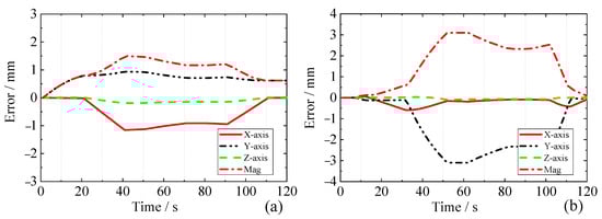 By adding the obtained for each piston stroke error to the HKM inverse kinematic solution, the simulated position error of the HKM end-effector is obtained and is shown in Figure 10. The end-effector position error distribution is similar to the piston rotation angle error distribution. During the lifting of the left outboard BB, the end-effector produces a maximum absolute error at the moment of 40 s, and during the lifting of the left inboard BB, the end-effector produces a maximum absolute error at the moment of 55 s. Since the BB height is more than 10 m and the gap between adjacent BBs is only 20 mm, the large position error of the HKM on the and axes may hit the adjacent BBs to affect the stable motion of the HKM. In addition, the end position error is also influenced by the overall control error, rigid–flexible coupling deformation error, machining error, assembly error, creep error caused by wear, etc., which further causes the risk of collision. Therefore, it is necessary to compensate the end position error of the HKM to improve the operation accuracy.
