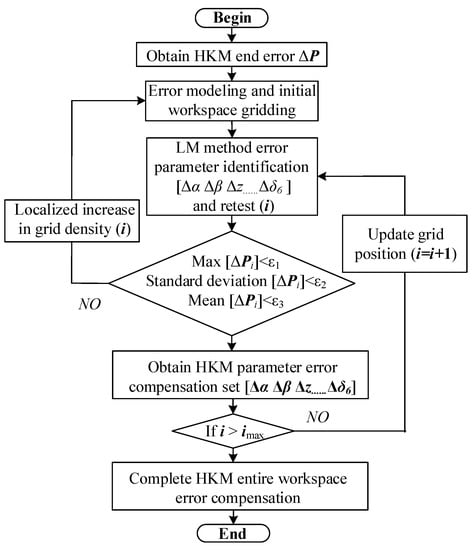 Third, we performed the Levenberg–Marquardt method of parameter error identification [37]. For a single grid, a single parameter set can be used to compensate under the premise of satisfying a certain position accuracy. Parameter error calculation is a nonlinear parameter identification process.