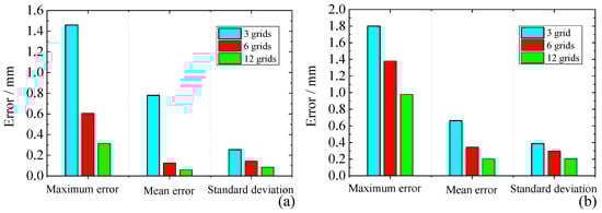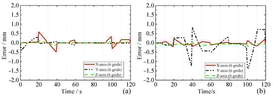 Figure 13a,b show the residual position error of the end-effector during the HKM lifting the outboard and inboard BBs, respectively. After analyzing the results, we can obtain that the end position error is significantly reduced after compensation, but there are still large position errors at the moments of 20 s, 40 s, and 100 s. The main reason is that the grid density of these positions is small. When the HKM end-effector position error varies a large amount on a certain time series, using a set of parameters for error compensation will lead to poor compensation at the start and end moments. The use of local grid encryption can reduce the amount of position error variation within a single grid, which can effectively improve the compensation effect. Figure 14a,b and Table 3 show the compensation effect of the process of the HKM lifting the left outboard and inboard BBs with three grid densities. The results show that the maximum error, mean error, and standard deviation decrease significantly when the grid density increases. The higher the grid density, the higher the accuracy of the HKM end position, but with it, the computational amount also becomes larger. Reasonably limiting the accuracy index of the HKM end-effector and using a local grid encryption method will maximally solve the problems of accuracy and computational amount.