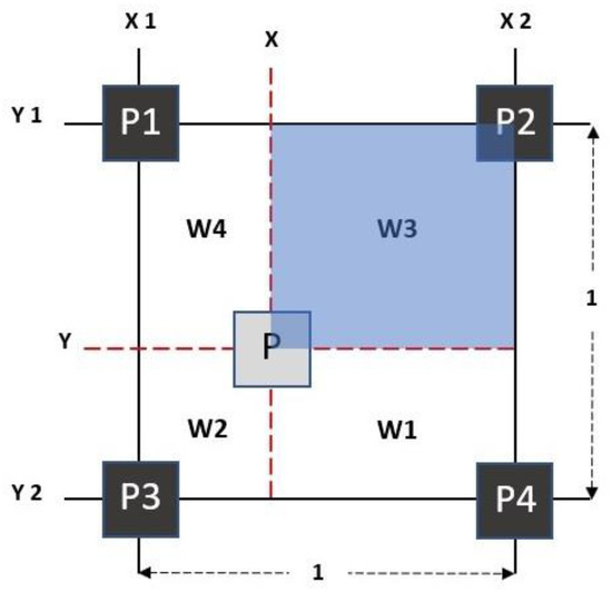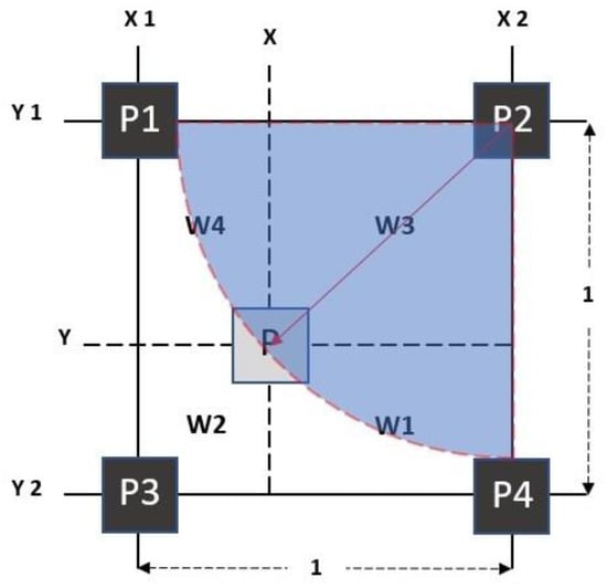 A tetragon is another name for a quadrilateral, which is a geometric figure consisting of four sides or line edges, and which are connected by four corners or vertices [58,59]. Note that a quadrilateral or tetragon has properties such as having four sides or edges, four vertices or corners, and interior angles that add to 360 degrees [58]. Figure 2 shows that a unit square (P1, P2, P3, P4) is composed of four tetragons with areas depending on the x-y coordinates of P. Such areas, for example , are used as pixel weights and the P value is obtained using Equation (4).
