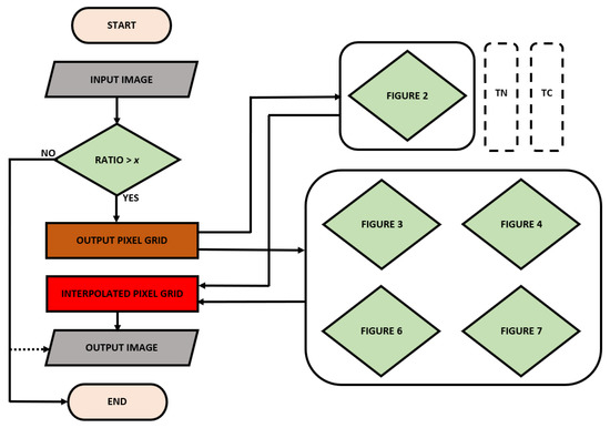 Figure 8 illustrates the simplified or generalized flowchart of the procedure of how the image interpolation generally works for upscaling/zooming-in purposes by TB, MD, HR, AT, and AC. Specifically, Figure 8 shows at which step interpolation weighting schemes are needed. Proposed image interpolation methods are different from traditional methods in terms of, or at the level of, the weighting schemes. Note that traditional nearest neighbor interpolation (TN) and traditional bicubic interpolation (TC) also follow the same procedure (as shown in Figure 8) but use different weighting schemes [10,23]. In addition, note that, for image upscaling or zoom-in purposes, the value of () in Figure 8 must be at least equal to one.