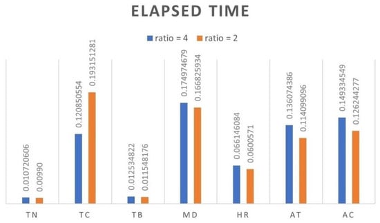 In this section, the main goal was to use IQA metrics capable of predicting the quality of an interpolated image accurately and automatically. However, in Figure 9, the computational efficiency was evaluated by measuring the elapsed time. As can be seen, in Figure 9, the TN remained the fastest of all algorithms, because, in each scaling ratio case, it used the smallest average time, among the other algorithms mentioned. The elapsed time by the TB was shorter than MD, HR, AT, and AC. The main reason for the slowness of new or non-traditional algorithms was increased computational efforts which required more MATLAB lines reading time. For example, TN is the fastest because it does not do any computations. It only uses the destination image coordinates to locate the corresponding coordinates in the source image and those that match, their pixel values are copied from the source image to the destination image. That is not the case with any other algorithms mentioned, because, for example, the TB used the weighted average of four pixels to calculate each pixel value in the destination image. This required taking into account simultaneously a group of four pixels and sliding those four pixels kernel over the entire image, which understandably would take more time than a “copy-paste” like operation on which the TN was based. It is important to note that the software built-in interpolation functions of the traditional TN, TB, and TC normally perform better than the manually implemented functions.