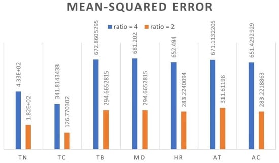 Now focusing on IQA metrics to predict automatically and/or accurately the image interpolation quality—Figure 10 presents the average scores that each interpolation algorithm produced or achieved in terms of the MSE. As can be seen, when the scaling ratio was 2 and 4, the TC achieved the best SME scores among traditional and non-traditional image interpolation algorithms. Focusing on non-traditional image interpolation algorithms alone (i.e., MD, HR, AT, and AC), it can be seen that the AC-based algorithm achieved the best MSE scores in both cases involving the scaling ratios equal to 2 and 4. Here, it is important to note that the lower MSE value (closest to zero) theoretically means the better image interpolation quality.