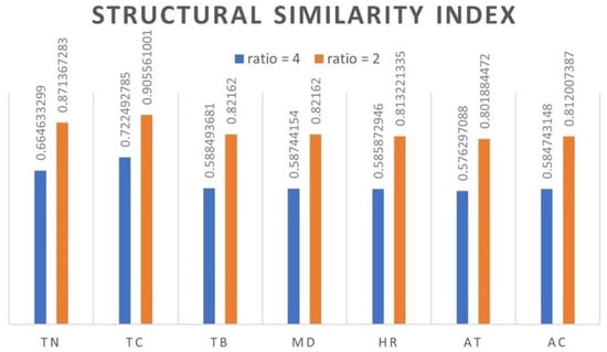 Figure 11 presents the average scores, each interpolation algorithm produced or achieved in terms of the SSIM. As can be seen, for the cases involving all image interpolation algorithms as well as the scaling ratio equal to 2 and 4, TC achieved the best SSIM scores among all image interpolation algorithms mentioned. Focusing on image interpolation algorithms based on new weighting schemes alone, when the scaling ratio was 2, the HR-based algorithm achieved better SSIM scores than AC, AT, and MD-based image interpolation algorithms. In addition, when the scaling ratio was 4, the MD-based algorithm achieved better SSIM scores than AC, AT, and HR-based image interpolation algorithms. It is important to remember that, in theory, the higher SSIM score (closest to 1), means the better image interpolation quality.