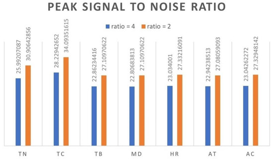Figure 12 presents the average scores, each interpolation algorithm produced or achieved in terms of the PSNR. Among all image interpolation algorithm cases, TC achieved the best PSNR scores. However, among non-traditional image interpolation algorithms, when the scaling ratio was 2, the HR-based algorithm achieved better PSNR scores than AC, AT, and MD-based image interpolation algorithms. Moreover, when the scaling ratio was 4, the AC-based algorithm achieved better PSNR scores than MD, AT, and HR-based image interpolation algorithms. In addition, here, it is important to remember that, in theory, the higher PSNR score (closest to 89) means the better image interpolation quality.