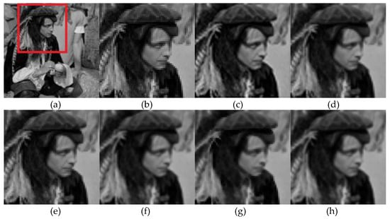 (a) Man test image inside a red square: (b) traditional nearest neighbor (TN), (c) traditional bicubic (TC), (d) traditional bilinear (TB), (e) normalized minimum side-based diameter-based (MD), (f) normalized hypotenuse radius-based (HR), (g) normalized virtual pixel length-based height for the area of the triangle-based (AT), and (h) normalized virtual pixel length for hypotenuse-based radius for the area of the circle (AC) interpolation algorithms.