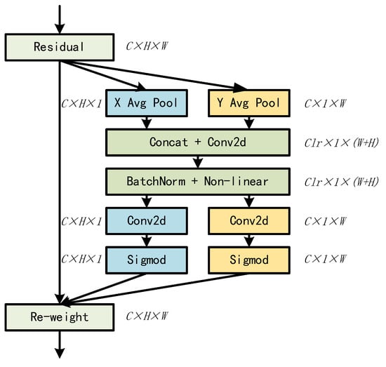 It is important to ensure that the reduction in detection accuracy is not significant. It3 may be useful to provide a brief review of how coordinated attention approach [28,29,30,31] works.The CA attention mechanism is achieved by averaging pooling in the horizontal and vertical directions respectively. The spatial information is then encoded using a converter, and finally the spatial information is fused into the channels in a weighted manner so that the CA attention mechanism takes into account the spatial and channel information in a comprehensive manner. Figure 1 shows the workflow of the coordinate attention mechanism. It can be easily found that as the coordinate attention acquires feature mapping in both vertical and horizontal directions separately, it will perform the following operations: