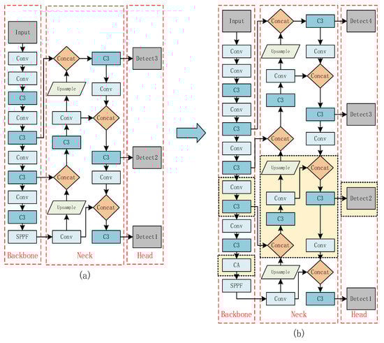 Our proposed YOLOv5-RC network is obtained after modifying the network structure by the previously mentioned method, and the network model changes as shown in Figure 2.