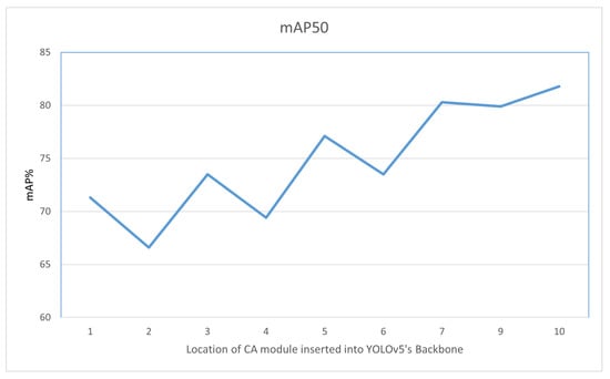 As shown in Figure 3, the x-axis indicates the location of the CA module inserted into YOLOv5’s backbone. It is easy to find that the accuracy of the network gradually increases as the coordinate attention insertion location is moved backwards. Finally, from the above results, the best location of coordinate attention insertion is the 10th which is nearly the end of YOLOv5’s Backbone. We believe that coordinate attention has dual attention characteristics of space and channel, and the spatial attention aspect will be influenced by the Conv and C3 structures. In YOLOv5’s Backbone, Conv will extract features to make the feature map smaller, while C3 will fuse features to make them richer. Therefore, when inserting coordinate attention in Backbone in turn, detection accuracy will show a wave-like trend after each Conv and C3. In YOLOv5’s Backbone, the number of channels gradually increases, and the channel attention part of coordinate attention will play a bigger role, making the overall trend of detection accuracy rise.