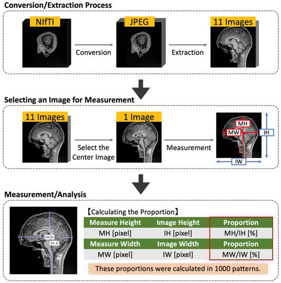 Images from two public databases were used. One database is the Decoded Neurofeedback (DecNef) Project Brain Data Repository (https://bicr-resource.atr.jp/srpbsopen/ (accessed on 28 December 2022)), which is part of the Japanese Strategic Research Program of Brain Sciences (SRPBS) supported by the Japanese Advanced Research and Development Programs for Medical Innovation (AMED) [33]. Another one is the “Healthy Brain Network” published by the Child Mind Institute (http://fcon_1000.projects.nitrc.org/indi/cmi_healthy_brain_network/ (accessed on 28 December 2022)) [34]. This study obtained T1-weighted images of 1000 subjects (men = 500, women = 500) aged 5–79 years from these databases (Table 1). The images were sourced from multiple centers. Therefore, the minimum to maximum width and height of the images used in this study ranged from 180–320 mm and 138–320 mm, respectively. When the same number of male and female data was obtained, care was taken to adjust the distribution of the number of persons by age to be as uniform as possible.