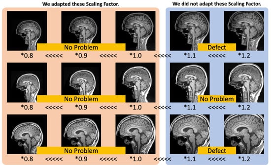 Since the lower limit of the subject age was set lower than that of previous studies, it cannot be denied that the age estimation in the present study is based on the size of the cranium and brain, not on the structural differences of the brain. Since the proportion of the brain in the MRI image can be changed by setting the field of view (FOV) and other factors, the size of the head in the MRI image tends to be the same to some extent, if we simply consider the size of the head in the image. However, considering the fact that there is a difference in the standardization of the head size, it cannot be eliminated that the age estimation is based only on the size of the cranium and the brain. To exclude the influence of the head size, the data augmentation of brain size rescaling was performed. Since the results of the actual measurement of head standards (Figure 1 and Figure 2) and images that included a part of the brain (Figure 3) are missing due to magnification, scaling factors of data augmentations as 0.8, 0.9, and 1.0 were conducted in this study. The measured angles of the subcallosal line (the line connects the inferior surface of the genu of the corpus callosum to the inferior surface of the splenium of the corpus callosum) showed normality in the variation of the angle of the head (mean = −1.0°). Therefore, in this study, data augmentation on rotation was not conducted. Data augmentation by scaling down or equalizing was conducted.
