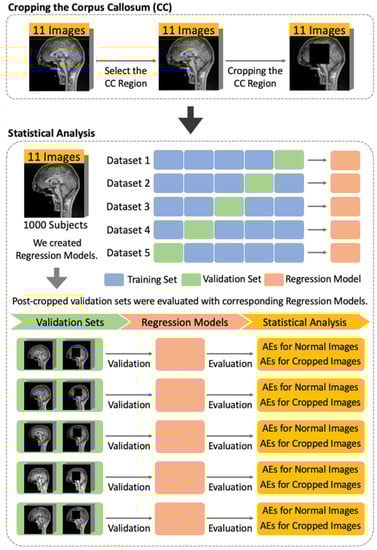 In this study, based on the results of the previous study, we created an image in which the corpus callosum region is removed (Figure 4). By determining how the accuracy of the estimation changes before and after the removal of the corpus callosum region, it is possible to examine whether the corpus callosum region is a useful region for age estimation in this method. As a specific analysis procedure, we used the method for examining significant differences as described in Section 2.6.