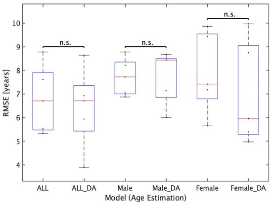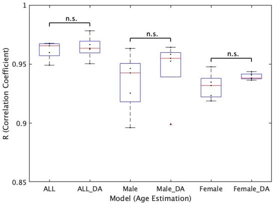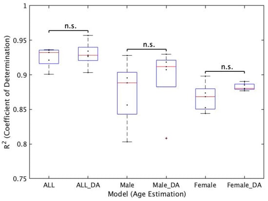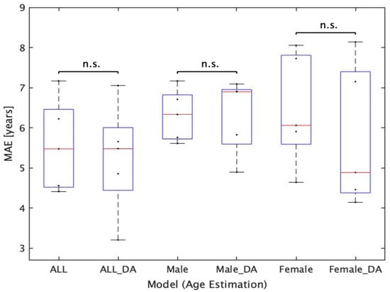 Based on this trend, we conducted a statistical significance study using the absolute error (AE) of each test data. The AE of 200 subjects for ALL_Model and the AE of 100 subjects for Male_Model and Female_Model were used to confirm the normality by the Shapiro–Wilk test, and when the normality was found, the F test and t-test were used to examine the statistical significance. In the case of nonnormality, the Wilcoxon rank sum test was used to examine the significance of the difference. A p value less than 0.05 was considered statistically significant. Specifically, we used this method to examine whether there is a statistically significant difference in the accuracy of age estimation between Male_Model and Female_Model and whether there is a statistically significant difference in the accuracy of age estimation before and after the deletion of the corpus callosum region. In the former case, a total of 25 patterns (cross comparison for five patterns of Male_Model (Male_Model A–E) and five patterns of Female_Model (Female_Model A–E)) were examined for statistical significance using AE. Conversely, in the latter case, since the images before and after the deletion of the corpus callosum are paired (the original images are identical before and after the deletion), we examined the statistical significance of AE using five patterns each of ALL_Model, Male_Model, and Female_Model (15 patterns in total). The test data used for the input are images without data augmentation processing and images from which the corpus callosum region is removed.