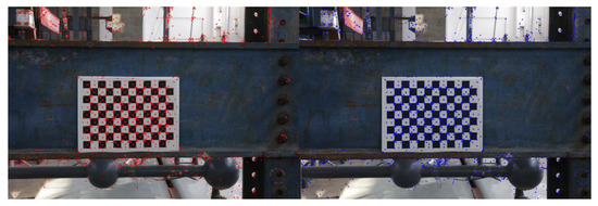 To validate that the image feature points on a bridge can represent homonymous points, we used a chessboard pattern to perform a validation test. Figure 1 shows the feature-point extraction results for two chessboard images at different positions. In the image shown in Figure 1, the position of the chessboard was shifted, whereas the position of the camera was fixed.