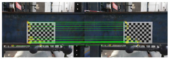 The feature points extracted (as shown in Figure 1) were matched, as shown in Figure 2. The number of feature points extracted from Figure 1 was 2117. To intuitively show the matching results for the feature points, only the matching results for the first 40 feature points are presented in Figure 2. As shown in the figure, the feature points extracted from the chessboard at different positions matched accurately, which verified that the feature points could represent the image’s homonymous points.